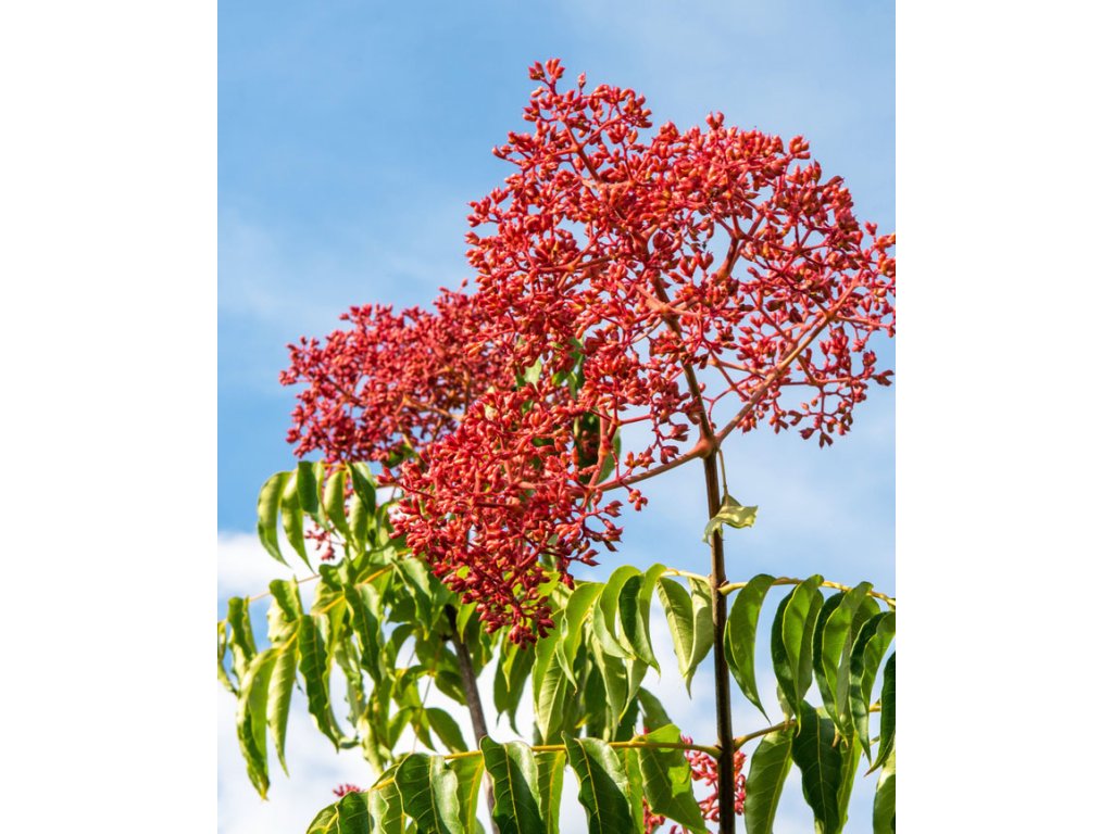 Koruna je v mládí pravidelná, postupně se rozšiřuje. Listy jsou dekorativní, složené, s hladkým povrchem. Květy tvoří velká latovitá květenství, která jsou výrazná i z větší vzdálenosti.