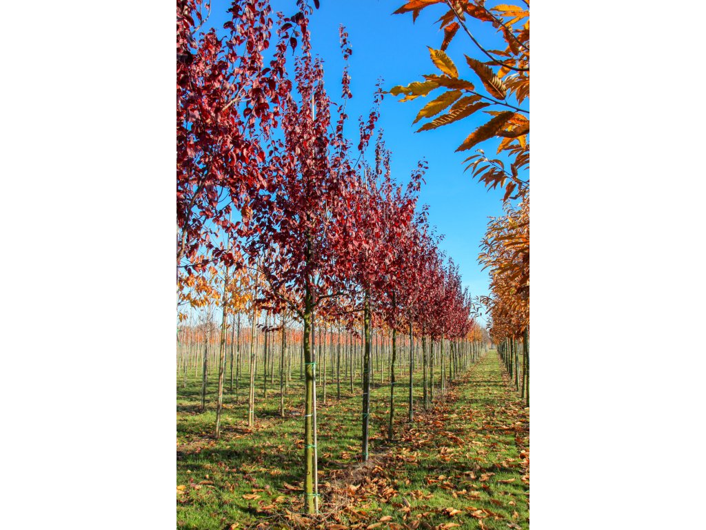 Slivoň myrobalán 'Nigra' v obvodu kmene 18–20 cm je zapěstovaný alejový strom vhodný pro výsadby s okamžitým vizuálním efektem.